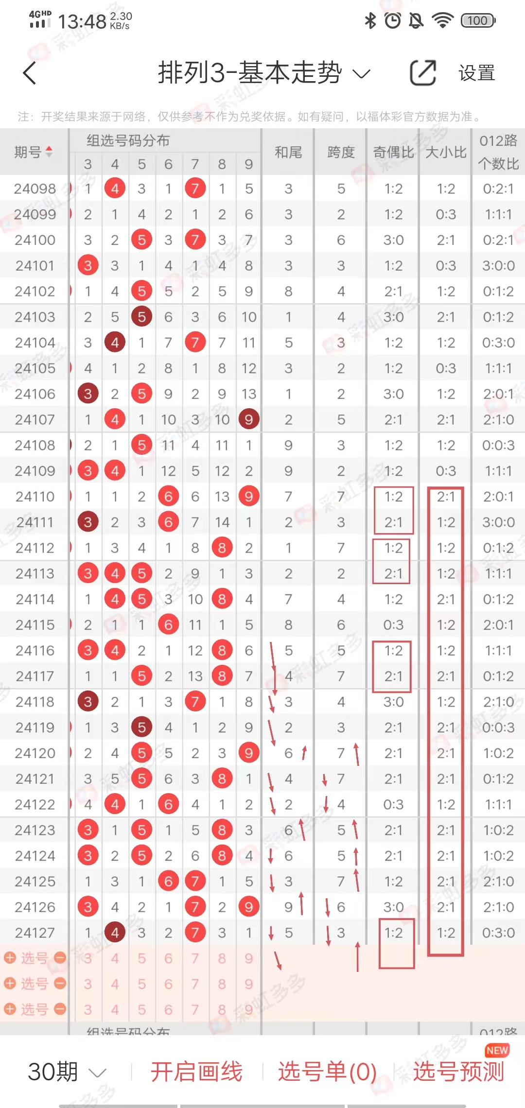 从近期规律走势看,近期2偶少连出,本期重点2奇,防2偶