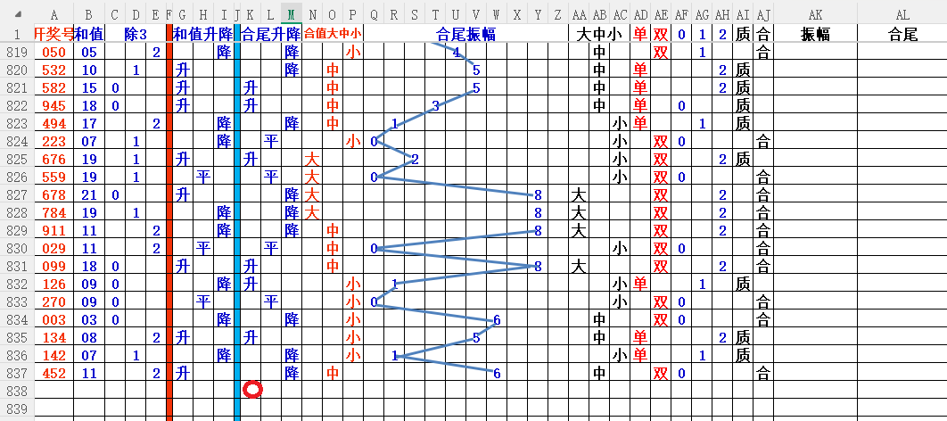 如上图3,和值升降平分析,和值升概率大,大于11和值