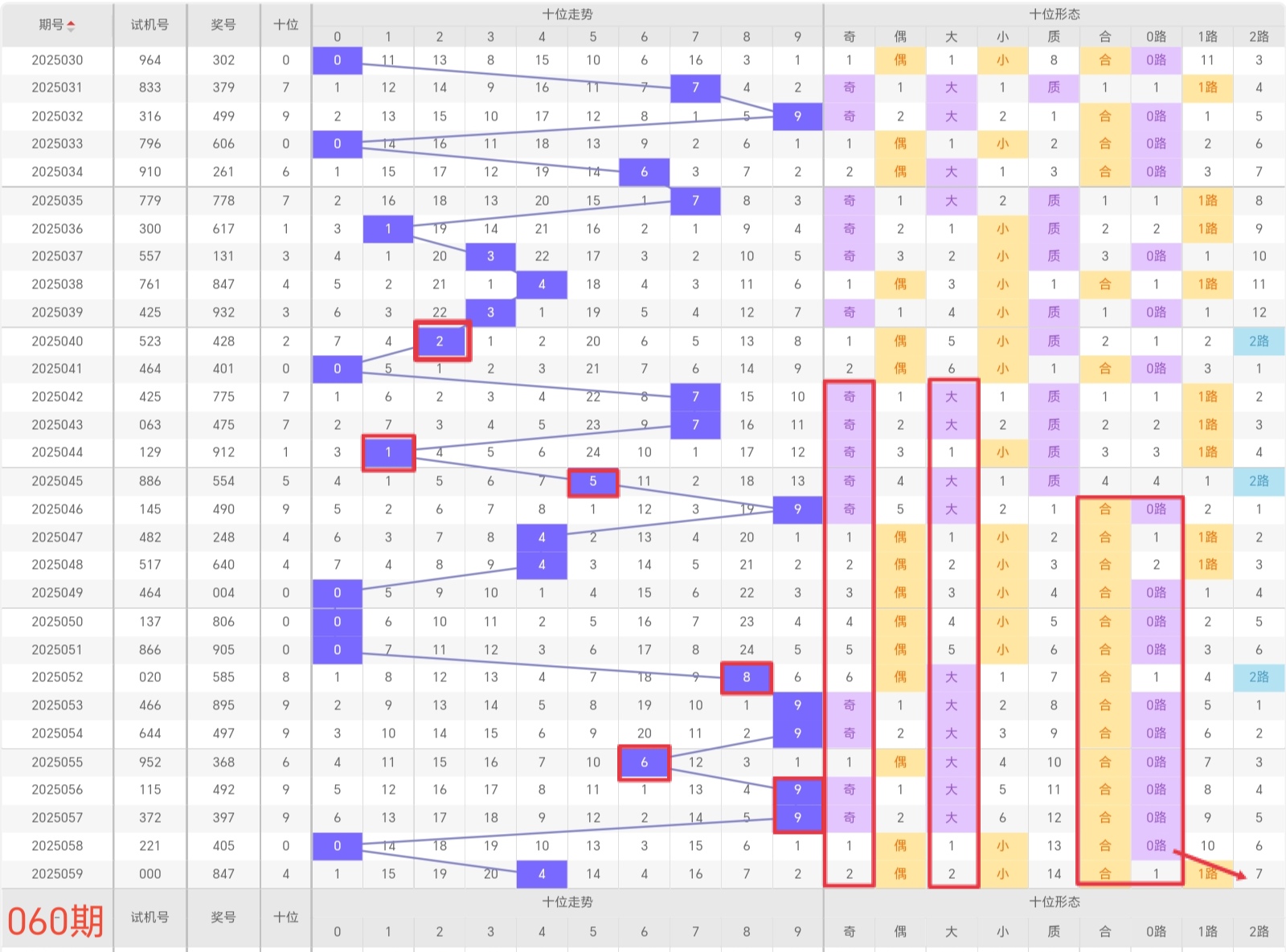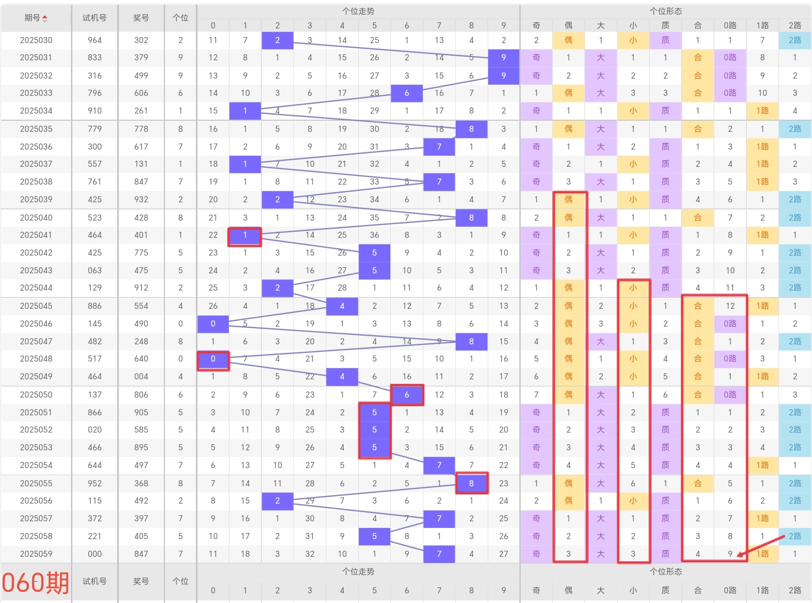 十位:上期在中间段3~6开出号码,6可能与4形成隔空斜连走势,本期可能会在中间段3~6和后半段7~9开出号码,十位连续两期开出偶数,本期可能开出奇数,可能是大数和合数,十位上期开出1路号码,本期可能开出0路号码,防守2路号码。