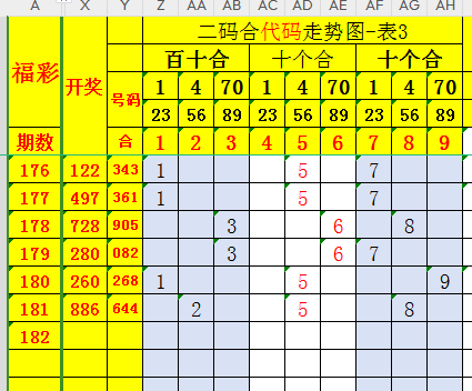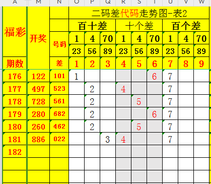 综上表 2表3 中 1 2 3 4 5 6 7 8 9 的代码,对应填写到二码合差代码走势图中,从而搭建出表 4如下:​