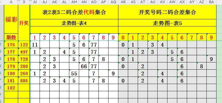 (五)依据开奖号换算出来的二码合差,搭建0123456789的二码合差走势图即:表5如下: