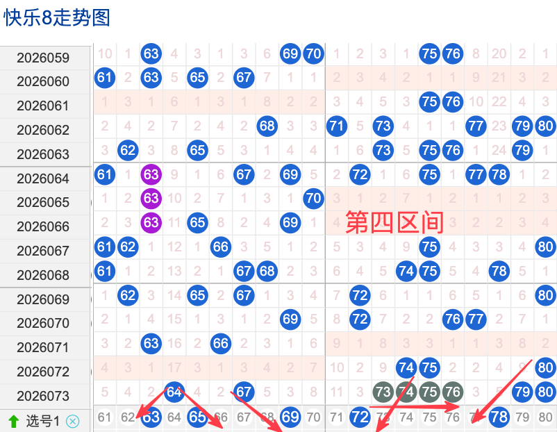 上期四区间开出了8个奖号(64.67.73.74.75.76.79.80)上期的四区开8个奖号呈现了一个递增趋势,开出的奖号6回补两码7回补5码,先来看号码65在近 30 期内属于还是很稳定的号码,近期出现频率相对,偶尔会间隔多期后出现一次,这个号码要注意防守,号码97具有一定的间歇性近期活跃度还是很稳定比如有时会间隔35期就再次出现,有时会间隔多期,近期整体出现频率比较,近期还是要关注的.号码72活跃度近期比较,有一定的间歇性。活跃度近期较热,整体走势有一定的波动性.