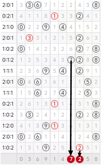 因为主打是复式六码,通过012路走势图分析得出(如下图),号码7有可能回落,号码2为当前热号,个人感觉号码2出的几率也比较大,回补的可能性仍然较强,综上所述,2026090期本人更中意号码7和号码2。