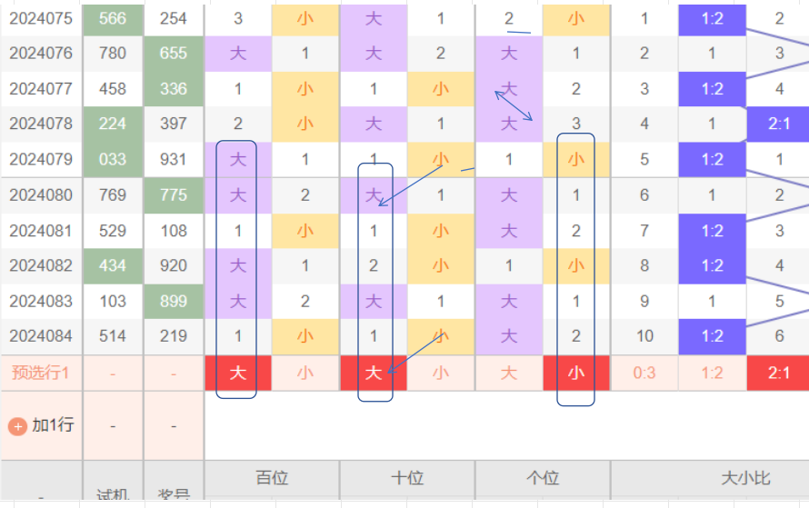2:如图所示,2大一小走势.个位的走势已连出2大,十位已出2小,百位已出1小.比例为1:2.本期给出的推测还是两大一小.个位小码:01234.十位大码:56789,百位大码:56789.这是给出的范围.下面通过其他走势缩小范围.
