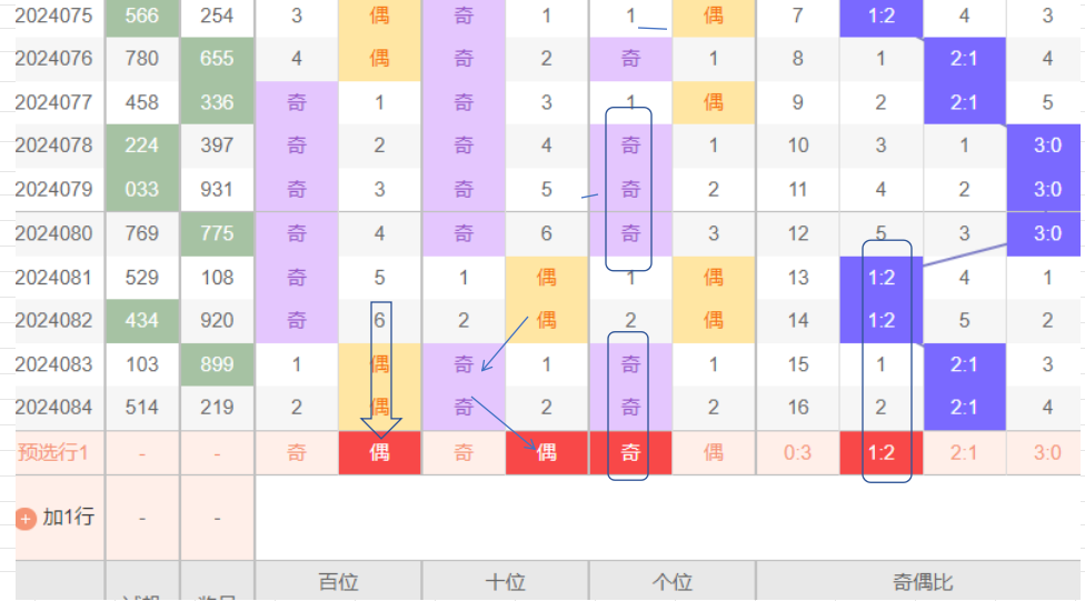 3:如图所示数据,上期开出两奇一偶,个位为奇,连开2期.十位为奇,连开2期.百位为偶,连开2期.比例2:1.本期推测1奇2偶,个位为奇,13579.十位为偶,24680,百位为偶,24680.结合下大小分析进行缩小,