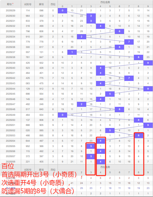 上期百位:4,近10期百位出号:0 8 9 5 8 4 3 4 3 4。最近10期大小变化分别:小大大大大小小小小小,奇偶变化分别:偶偶奇奇偶偶奇偶奇偶,质合变化分别:合合合质合合质合质合,根据近10期的出号规律本期百位首选隔期开出3号(小奇质),次选重开4号(小奇质),防遗漏5期的8号(大偶合),综上所述百位出号推荐5个号码:3 4 8 0 5。(出号概率由高排到低)。