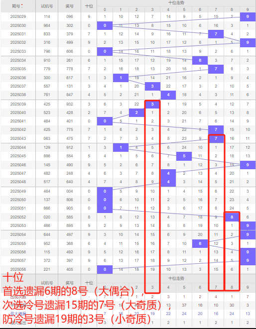 上期十位:0,近10期十位出号 :0 0 0 8 9 9 6 9 9 0。最近10期大小变化分别:小小小大大大大大大小,奇偶变化分别:偶偶偶偶奇奇偶奇奇偶,质合变化分别:合合合合合合合合合合,根据近10期的规律本期十位首选遗漏6期的8号(大偶合),次选冷号遗漏15期的7号(大奇质),防冷号遗漏19期的3号(小奇质),综上所述十位出号推荐5个号码:8 7 3 4 5。(出号概率由高排到低)。