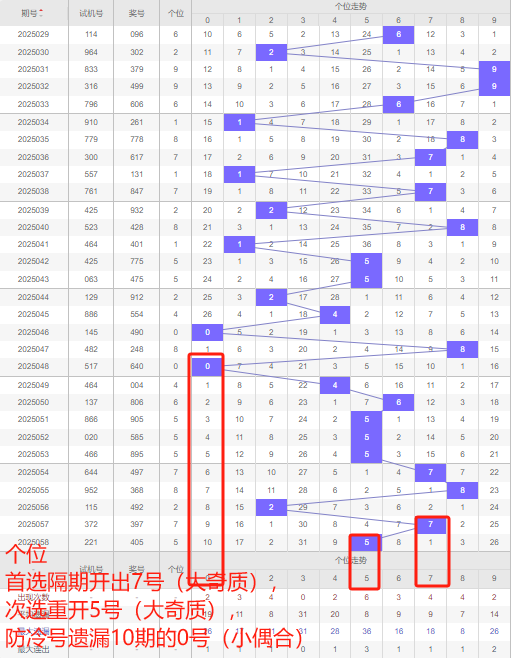 上期个位:5,近10期个位出号:4 6 5 5 5 7 8 2 7 5。最近10期大小变化分别:小大大大大大大小大大,奇偶变化分别:偶偶奇奇奇奇偶偶奇奇,质合变化分别:合合质质质质合质质质,根据近10期规律本期个位首选隔期开出7号(大奇质),次选重开5号(大奇质),防冷号遗漏10期的0号(小偶合),综上所述个位出号推荐5个号码:7 5 0 4 3。(出号概率由高排到低)。