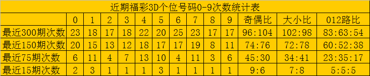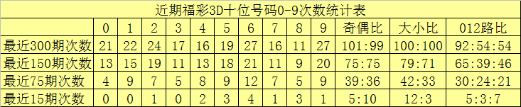 最近15期奖号由冷到热表现为:3、4、9→0次,6、7→1次,2、5、8→2次,1→3次,0→4次,奖号奇偶比为6:9,大小比为6:9,012路比为5:4:6。