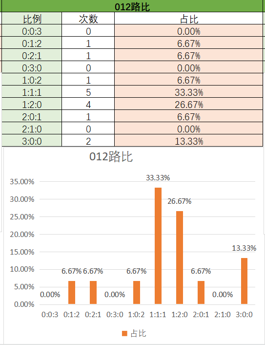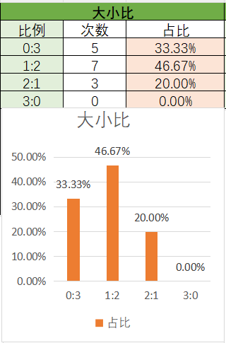 上期大小比为2:1,各个类型占比没有变化。可以看到近15期内1:2优势最好的,其次是0:3,然后是2:1。本期看好2:1开出,其次是1:2。