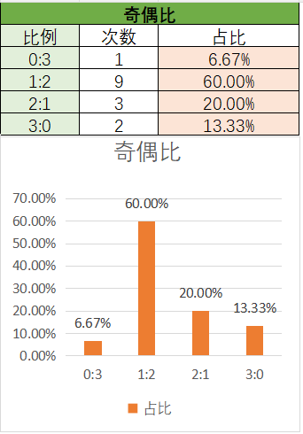 上期奇偶比为1:2,各个类型占比没有变化。近15期内1:2优势最大,其次是2:1,然后是3:0。上期开了1:2奇偶比,本期看好2:1奇偶比的开出,其次是1:2。