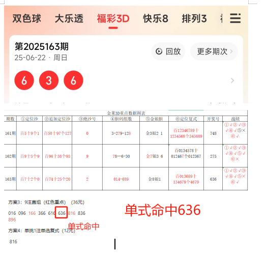 首先来看上期开奖号码为:636,和值为15。上期单挑和值15对,精华9注单式命中636直选等。