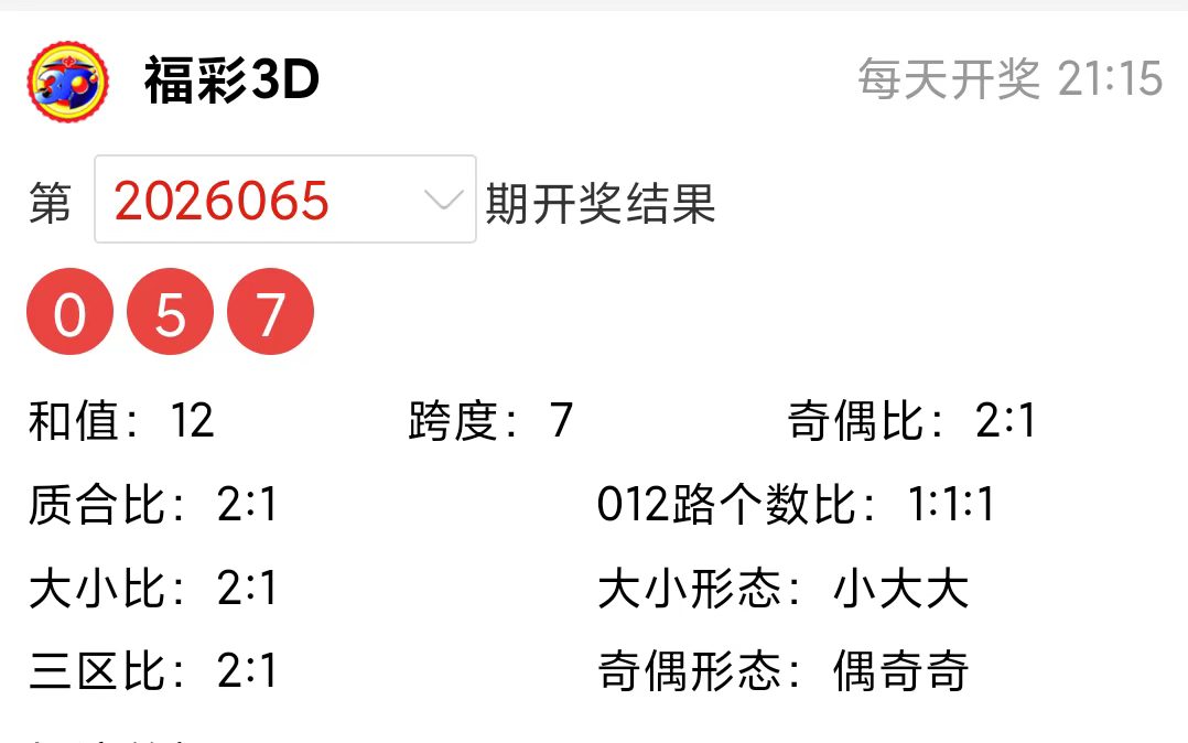 福彩3D上期(2026065期)开奖号码详情