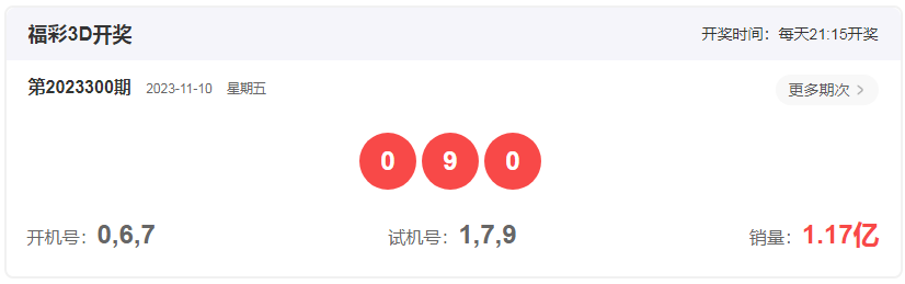 福彩3D第2023300期开奖号:090