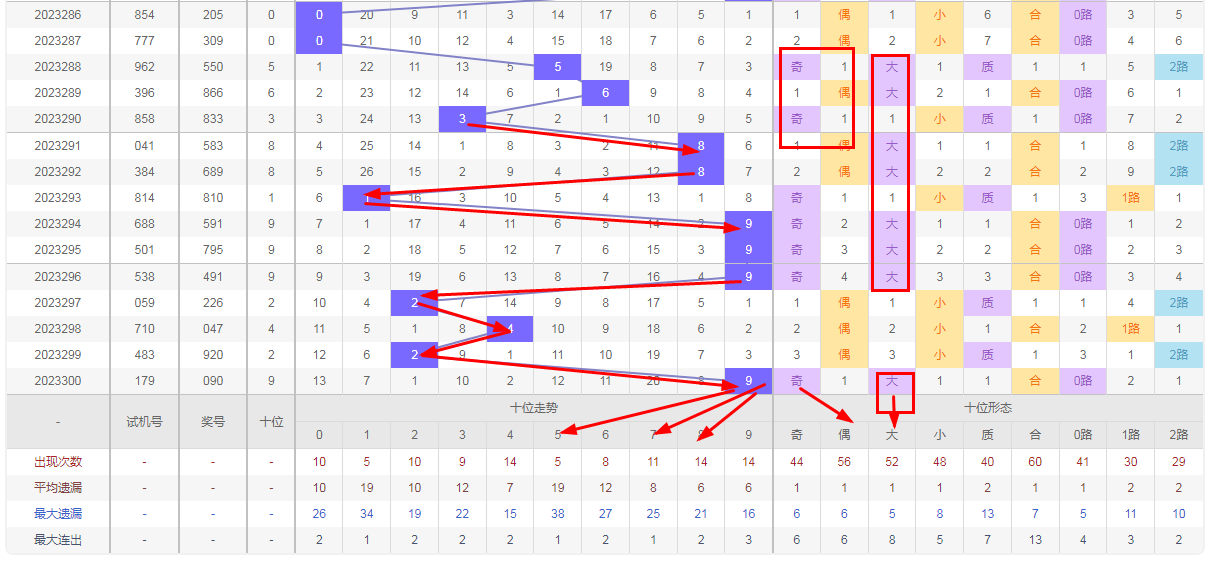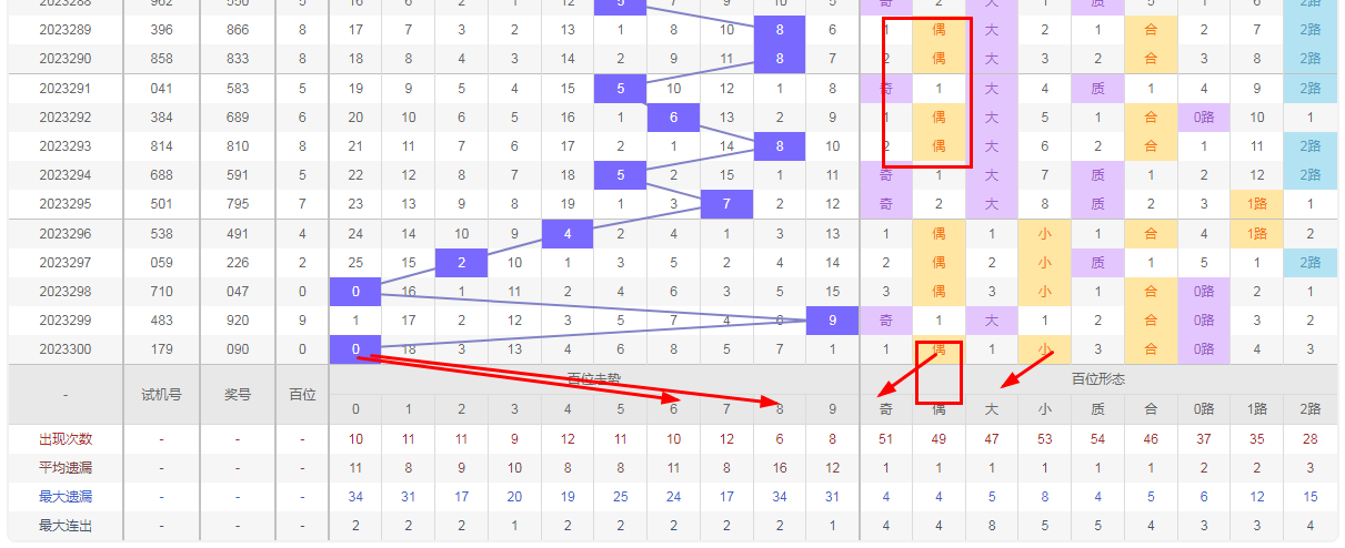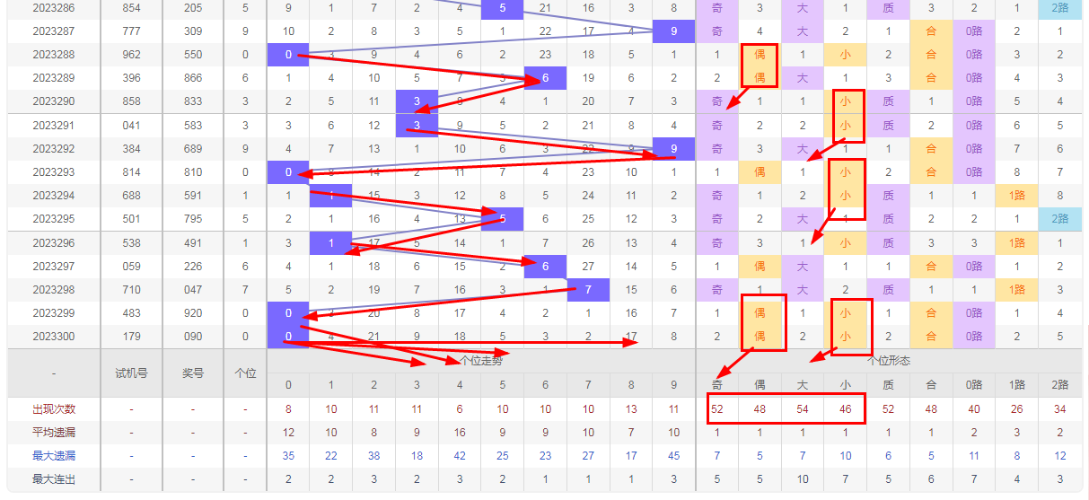 福彩3D个位分析:第300期个位号码0属于小数偶数,从以上个位走势图中可以看出近100期的大小比为54:46奇偶比为52:48大小数据上有点差异有向小数的需求但不是太明显,奇偶上的差距6点也在可接受范围,不太好看这时就要借助连线走势和遗漏数据来帮助我们缩水号码。从个位连续走势图上能看出向小数方向走到号码0后有拐头向小数的迹象。号码246 100期内出现次数也少于其它号码有回补需求,结合起来明显走向小数偶数的概率比走其它号码的概率大一点。因此福彩3D第301期个位看好小数偶数246.防守大数8 9