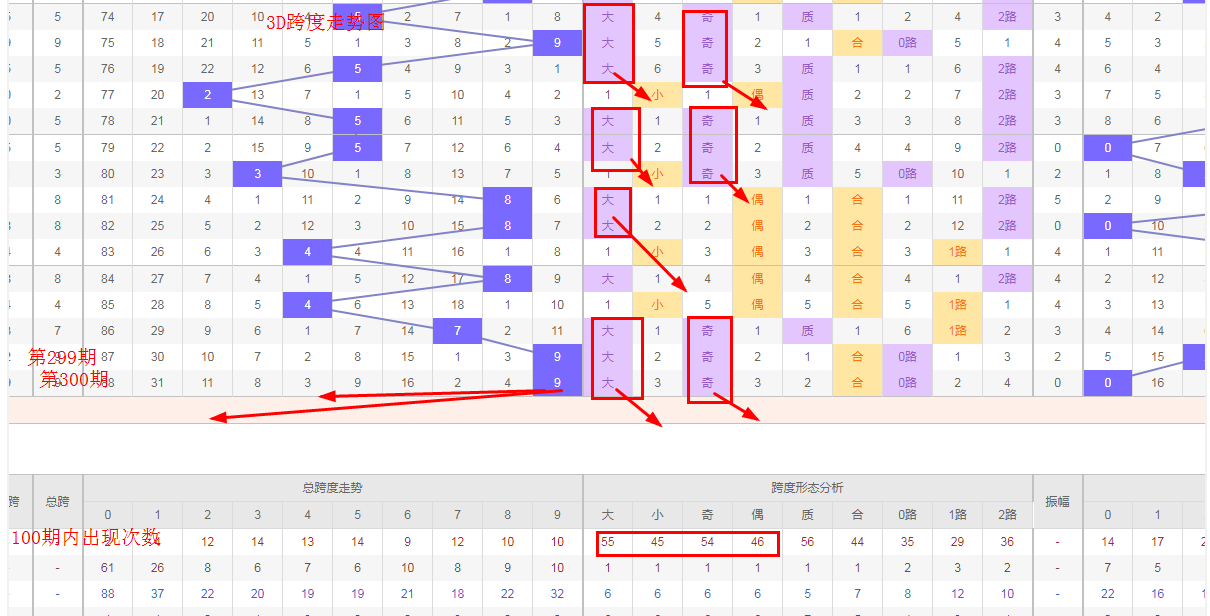 跨度分析:历史100期跨度大小比为55比45奇偶比为54比46,相差10点小数有回补需求,最近3期的跨度走势为大数奇数,9跨度连续直落两期,再次直落的概率不大,回归小数跨度的概率更高一点。上期开出大跨度9连线走势已到尽头将拐头向小跨度方但。3D第301期跨度参考234跨。防守大跨6