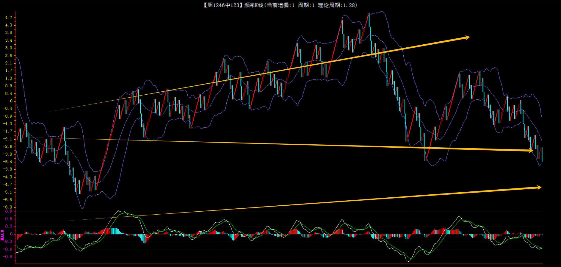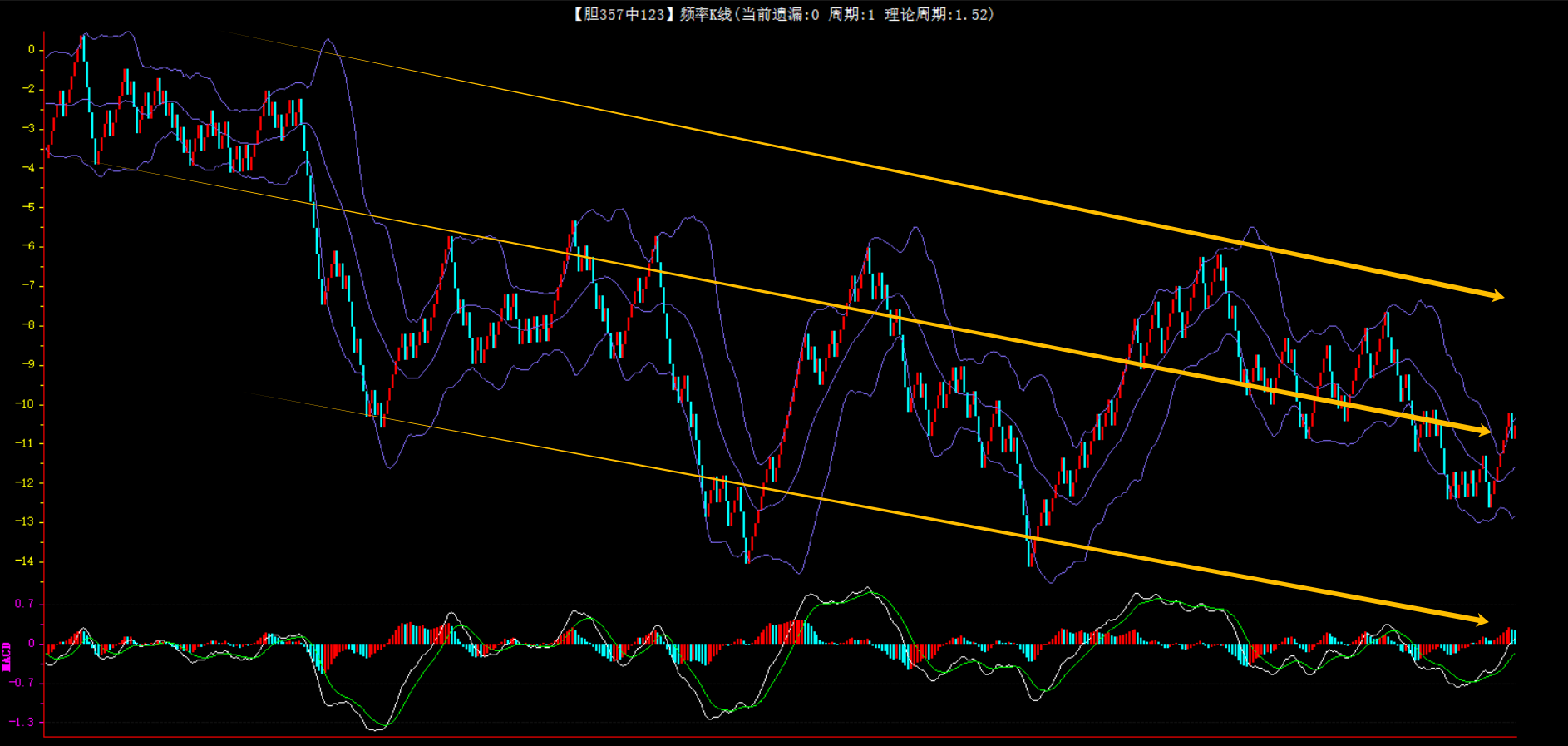整体趋势下行,上边沿线趋势向下,下边沿趋势也是向下,节点震荡,当前开1期,本期防守。