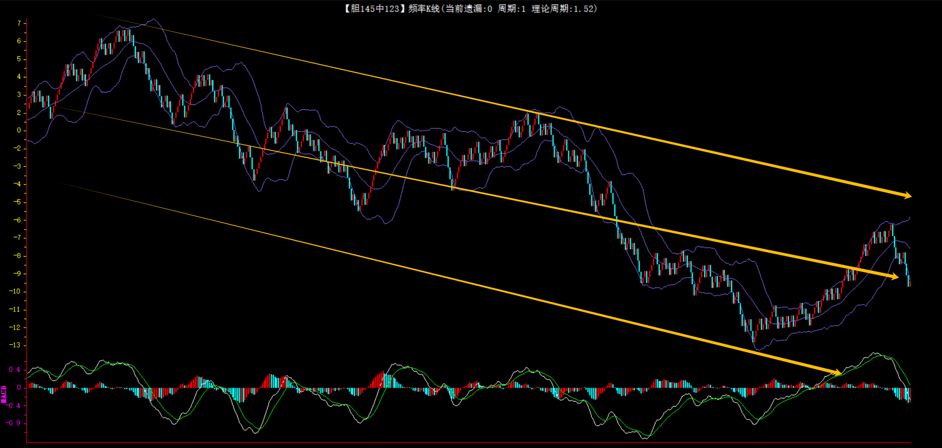 整体趋势下行,上边沿线趋势向下,下边沿趋势也是向下,节点震荡,当前开4期,本期防守。