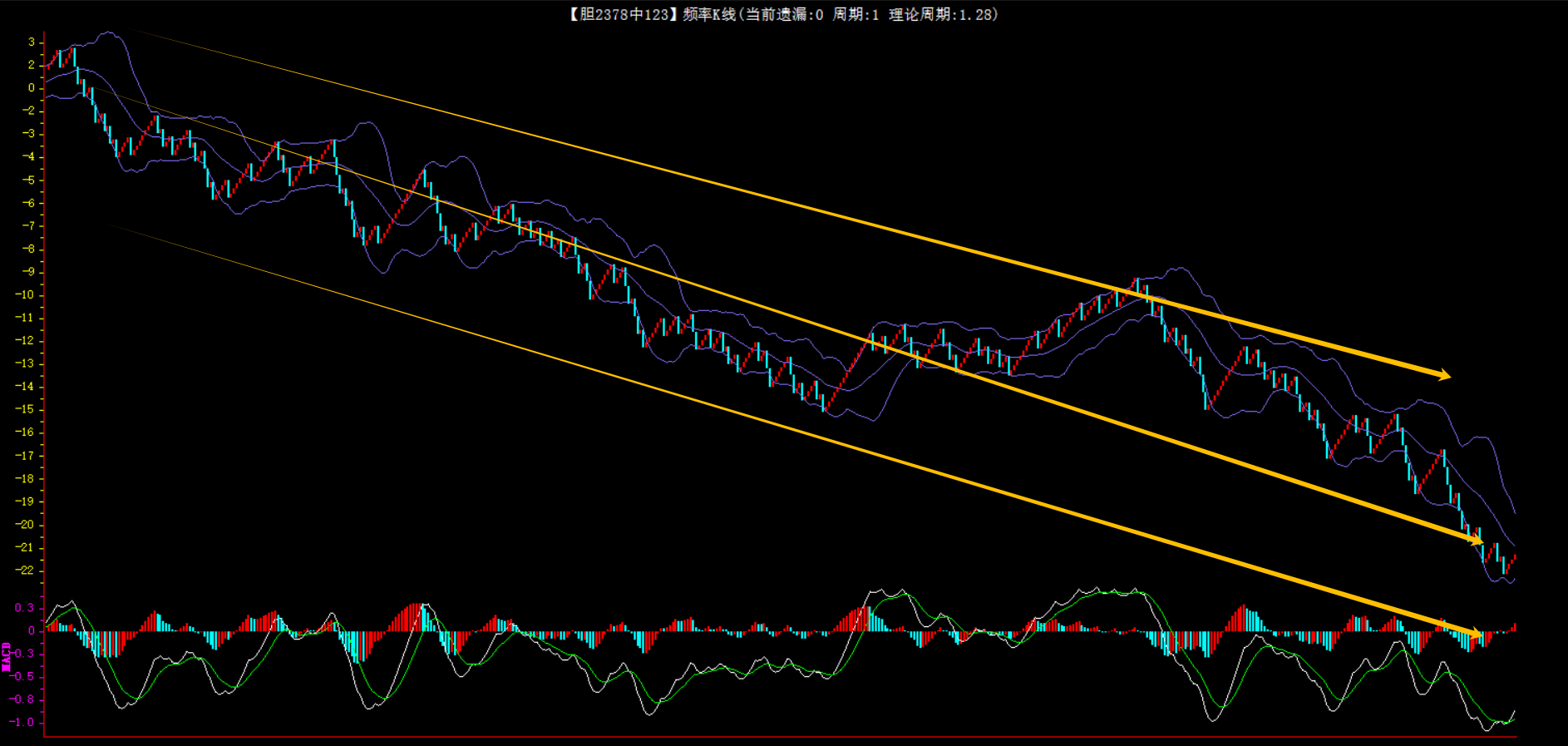 整体趋势下行,上边沿线趋势向下,下边沿趋势也是向下,节点震荡,当前开1期,本期防守。