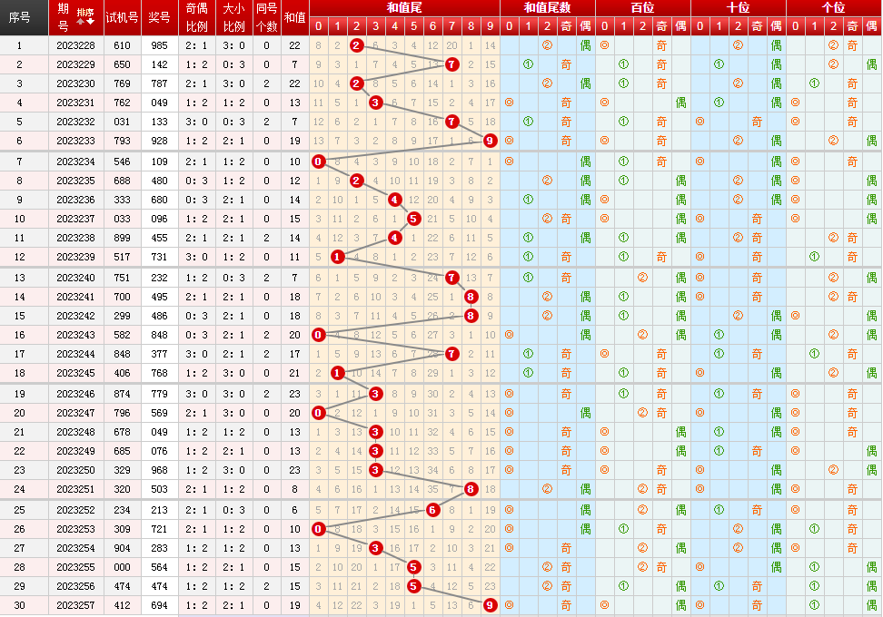 再来看看福彩3D最近三十期开奖号码及基本参数特征图(如下图)