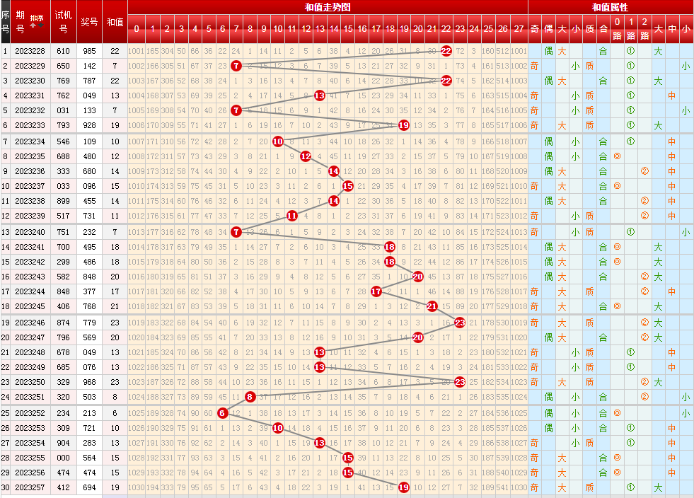 我们来看看福彩3D最近三十期开奖号码的和值分布及属性