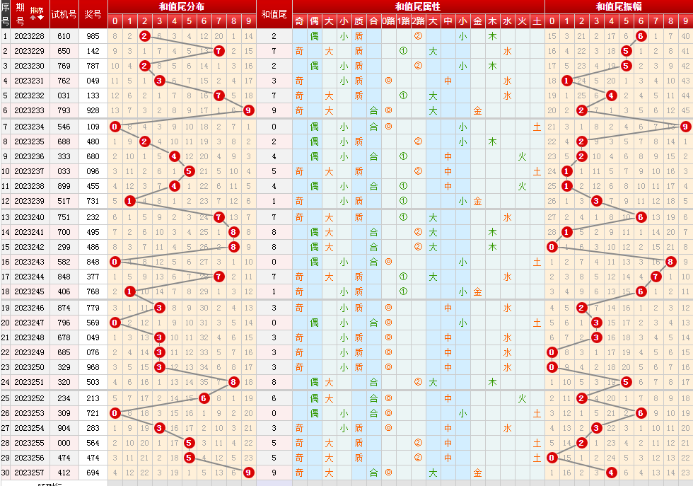 再看看福彩3D最近三十期开奖号码的和值尾分布及属性