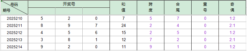 2025210期开奖号码520,我们可以看出近30期百位5出现1次,十位2出现4次,个位0出现3次。