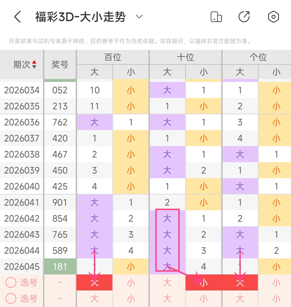 首先让我们回顾一下上期福彩3D第2026045期开奖号码为181,为组三形态,大小比为1:2,奇偶比为2:1,跨度为7,和值为10。