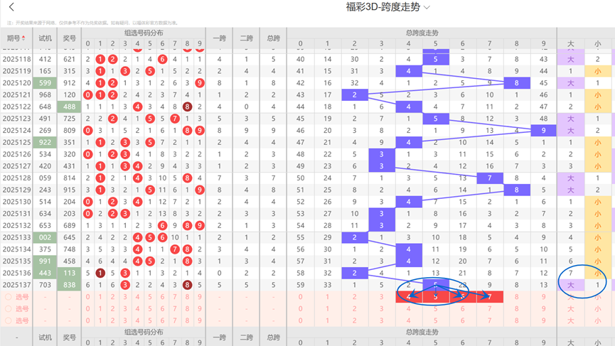 通过观察跨度及跨度属性走势可以发现:近10期内跨度较少开出019等号码,本期跨度开出019等号码的可能性较低,因此本期跨度选号时应该优先排除019等号码。结合上述跨度走势图来看,本期跨度仍然看好4567等号码。