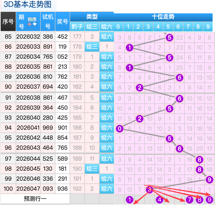 上期3D十位开出的奖号是3号,上期在十位上3号球这个号码是一个冷码的回补落位点,本期来看1号和4号球在十位上要注意这两个号码是有机会继续顺着上期的3号球继续走出两个号码的落位趋势这里的两码是小号码注意防守就好了7号球还是个常搭配4跨号的落位点然后8号球还是一个小周期回补的落位形态注意防守,再来看9号球是冷码个气隔期回补这个点位注意防守