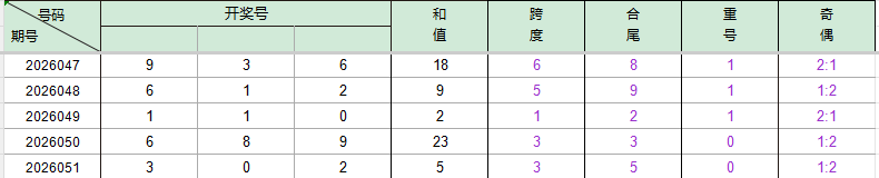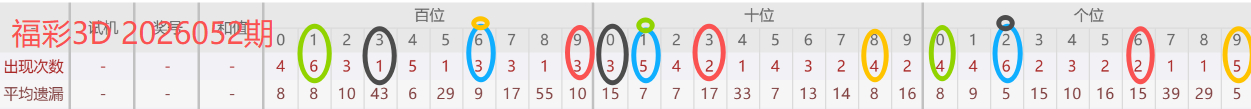2026051期开奖号码302,我们可以看出近30期百位3出现1次,十位0出现3次,个位2出现6次。