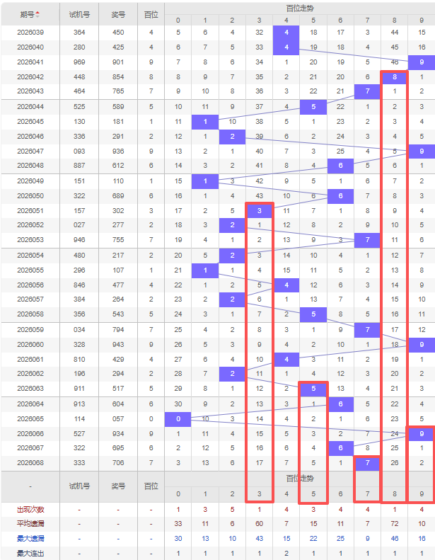 上期百位:7,近10期百位出号:5 7 9 4 2 5 6 0 9 6 7。最近10期大小变化分别:大大小小大大小大大大,奇偶变化分别:奇奇偶偶奇偶偶奇偶奇,质合变化分别:质合合质质合合合合质,根据近10期的出号规律本期综上所述百位出号推荐5个号码:3 5 7 8 9。