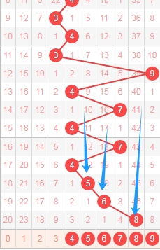 上图是福彩3D开奖号码从左到右定位第三位数字走势图,我标注出来的蓝色大箭头表示的都是遗漏周期,上期开出的数字8遗漏周期是46期,上上期开出的数字6遗漏周期是20期,那么本期可以关注出小遗漏周期的数字,那么就是数字456789,个人最看好数字456。