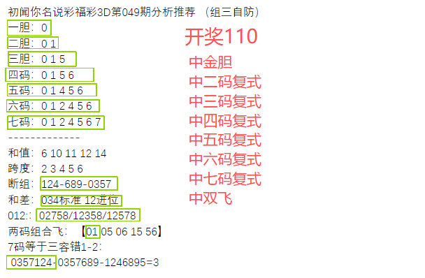 初闻你名说彩福彩3D第050期分析推荐 (组三自防)