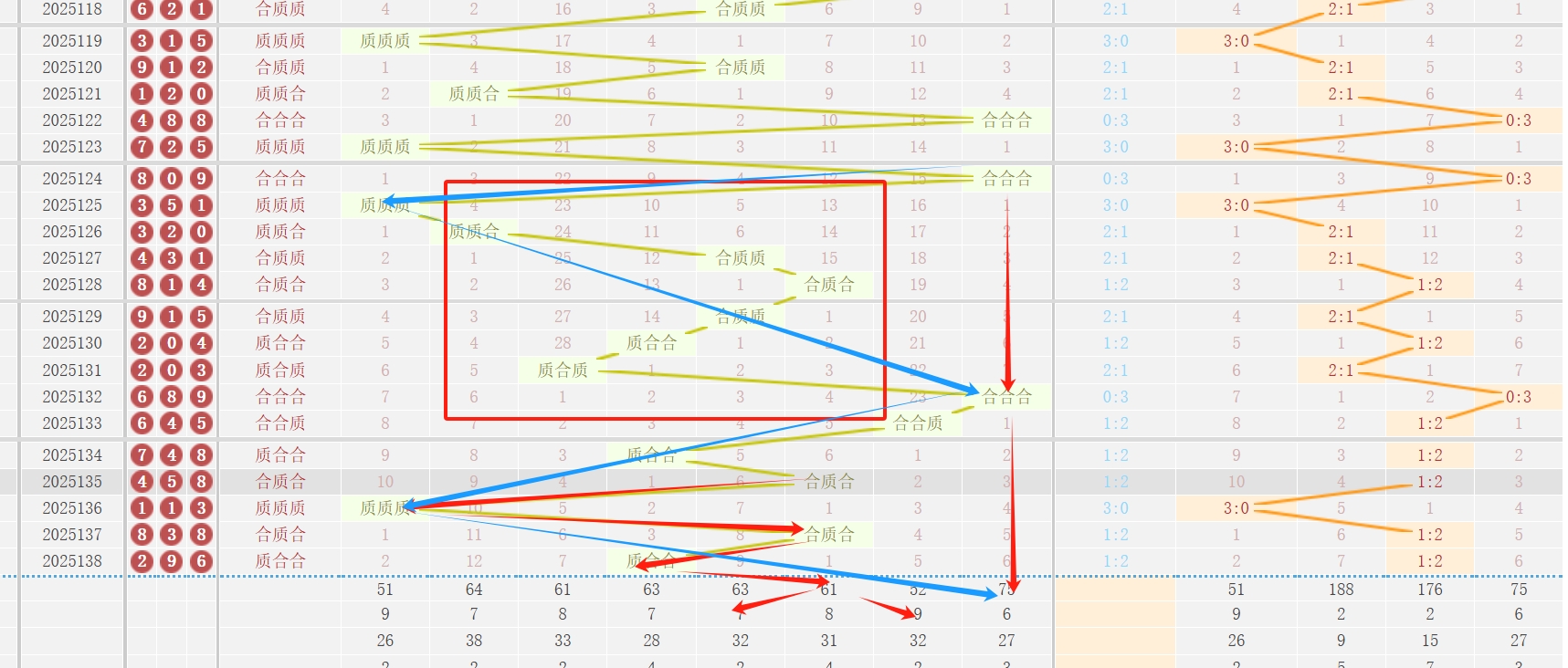 鉴于近期的奇偶条件不是很稳定,瘦瘦决定把质合条件放到文章里面供大家参考,很多时候奇偶条件不明朗的时候可以利用质合条件进行分析从而对奇偶条件定性,两者相辅相成。本期看好合质合再次开出,近期有过一个四连走势,这种走势出现后短时间内某一形态的直选形态多数会出现三次举个简单的例子:0走5,5走1,1走5,5走2说起来可能比较抽象但是说它这种走势为三顾茅庐大家可能就很好理解。然后不得不注意的是近一年内出现全质数走两合数的情况出现后有且仅有一次走出了全合,那么今天的全合数可以作为防守面去看   。主看两合全合。