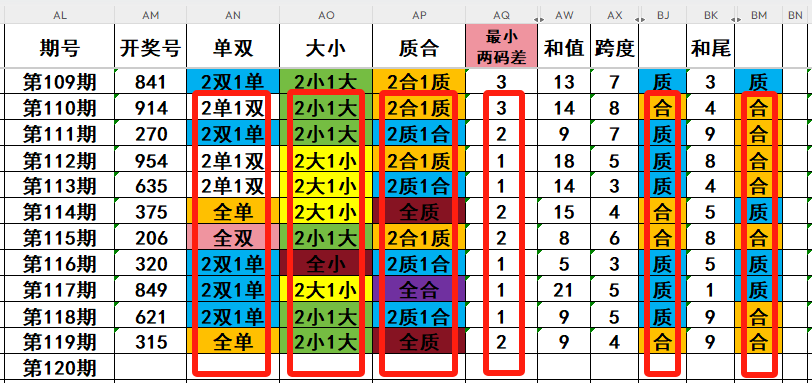 4,最近10天当中,最小两码差1开出5次,最小两码差2开出4次,最小两码差3开出1次,