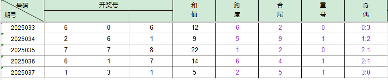 2025033期开奖号码606,我们可以看出近30期百位6出现5次,十位0出现5次(减位回补),个位6出现7次。