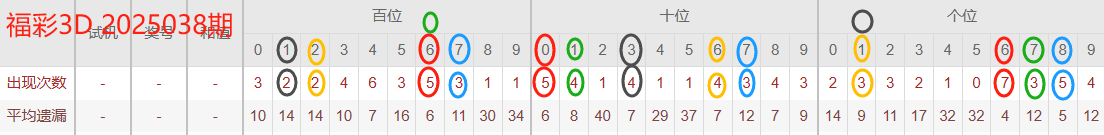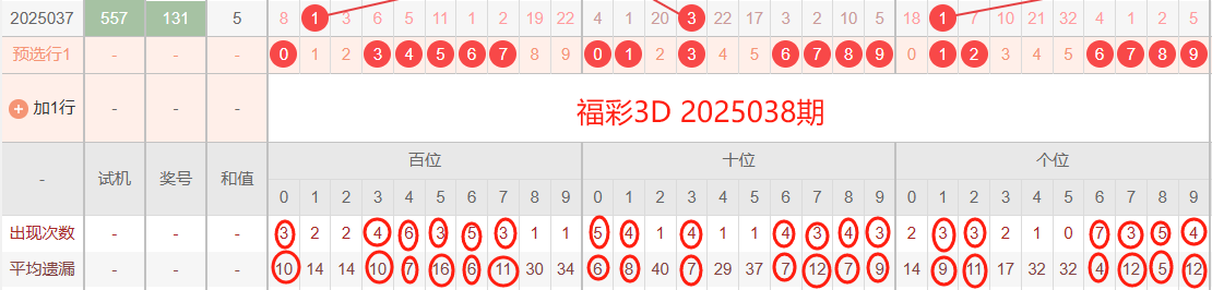 2025037期开奖号码131,我们可以看出近30期百位1出现2次,十位3出现4次,个位1出现3次(减位及时回补)。