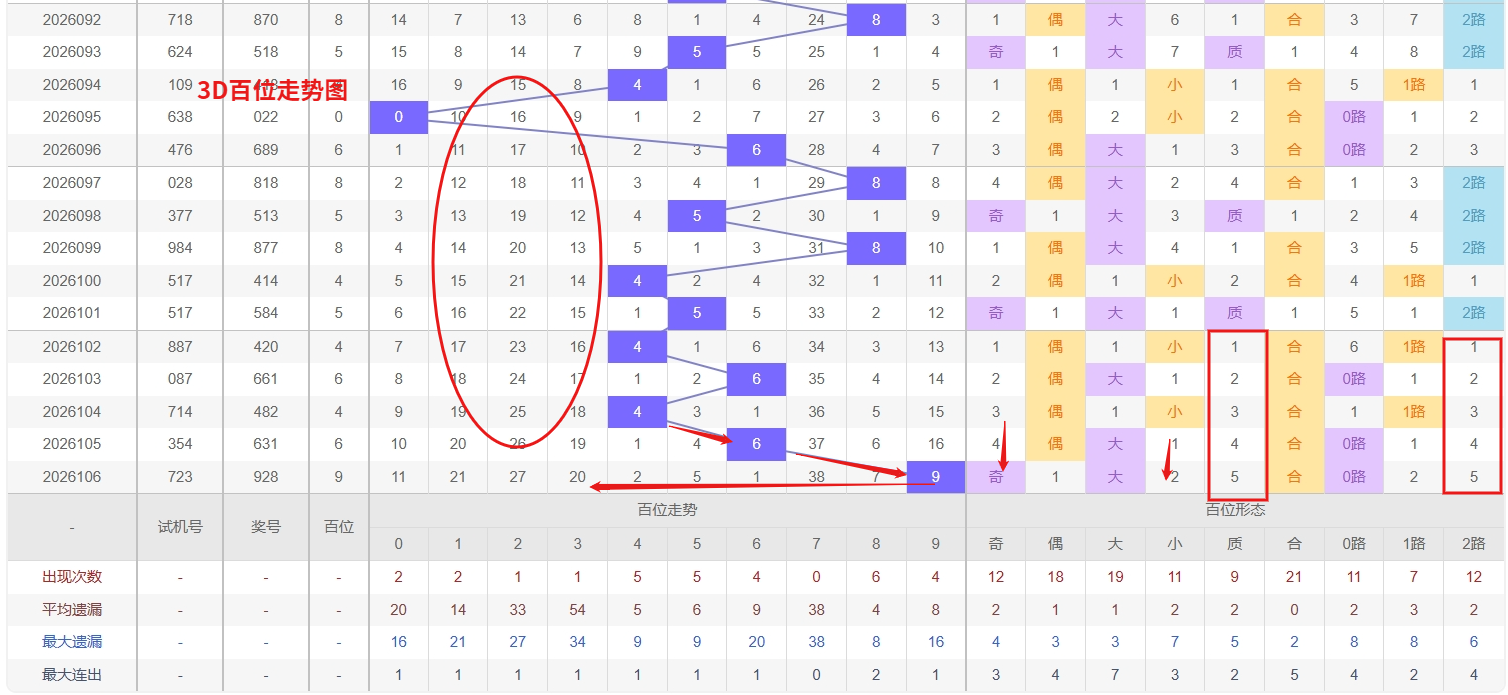 福彩3D百位分析:第2026106期百位开出号码9属于大奇数,从上面百位走势图上可以看出近100期大小比约为54:46奇偶比约为51:49。近期数据还是比较极端的符合文章开头介绍的求均衡规律非等量现象。但这种均衡不会持续最终会被偏态运行打破,然后循环往复。但短期内大小相差3点,小数过热大数有回补需求本期个人认为走大数的概率更高。上期百位落号“9”号球,在百位号码开出0路号码9后向大数方向走出3个振幅。那么通过分析上期百位落位号码分析,号码走出3个振幅,号码走为大偶数,开出0路号码9。通过对百位落号趋势来分析,百位号码落位后端,通过对近10期的走势来看百位号码大小交替频繁走2期大数又走3小数,3D百位近期热号区域中,有5个号码表现活跃,热度集中度较高,且从走势上看,这类热号往往具备惯性连下的特征,容易形成短期连开的小周期,因此接下来对热号的追踪不能轻易放弃,连下的可能性值得重点关注。与此同时,百位当前有一个冷号已遗漏达38期,远超其历史平均间隔,从大数定律和号码均衡回补的角度分析,这种深度遗漏往往预示着回补窗口正在临近,虽然冷号并不一定在下一期立即开出,但随着遗漏值不断刷新,其出现概率正在累积,不少类似走势中,冷号会在热号连下间歇期或热度短暂回落后突然回补。我们在百位关注的重点在12357这5个号码球上,百位号码近期奇偶切换频繁,9号球码属于0路号码奇数,现奇数开出过多有向偶数的趋势。所以福彩3D第2026107期百位看12357