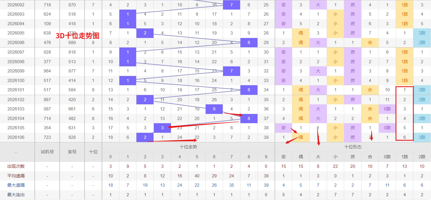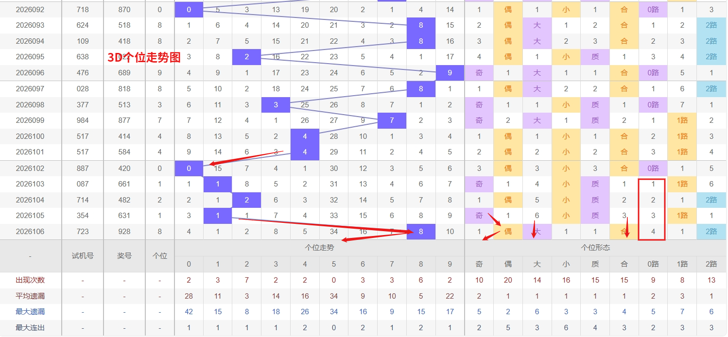 福彩3D个位分析:第2026106期个位开出号码8属于大偶数后端,从以上个位走势图中可以看出近100期的大小比约为48:52奇偶比约为51:49大小奇偶数据上有点差异有需求但不是太明显,不太好看这时就要借助连线走势和遗漏数据来帮助我们缩水号码。上期个位落号“8”大偶数2路号码球,号码开出了7振幅,连续多期的小振必被大振幅取代幅符合我们的预期,那么本期我们在个位考虑振幅走势走前依然要转变思路考虑大振幅,具体考虑(1-5)个振幅是我们主要的方向,那么在对个位落号情况进行系统的分析时我们可以明显的看到个位号码走势呈现大范围震荡,尤其是在号码的落位特点上表现的尤为突出,那么本期我们在个位分析时就要注意号码的风险,避免出现踏空。3D个位目前呈现出一个非常典型的热冷并存的格局,一方面热号2表现活跃,近期出现频率明显高于其他号码,从走势惯性来看,这种强势热号往往具备连下的动能,尤其是在个位走势没有出现剧烈转折的情况下,热号2继续出现的可能性不能低估,值得持续关注;另一方面,冷号5已经遗漏34期未出,远远超出其常规回补周期,从号码均衡和数据回归的角度分析,这种深度冷态往往预示着回补窗口正在逐步打开,虽然冷号的具体开出时机难以精准把握,但当遗漏值积累到一定程度后,其出现的概率会不断上升,遗漏多都会迎来一次回补。福彩3D第2026107期个位看好02356。