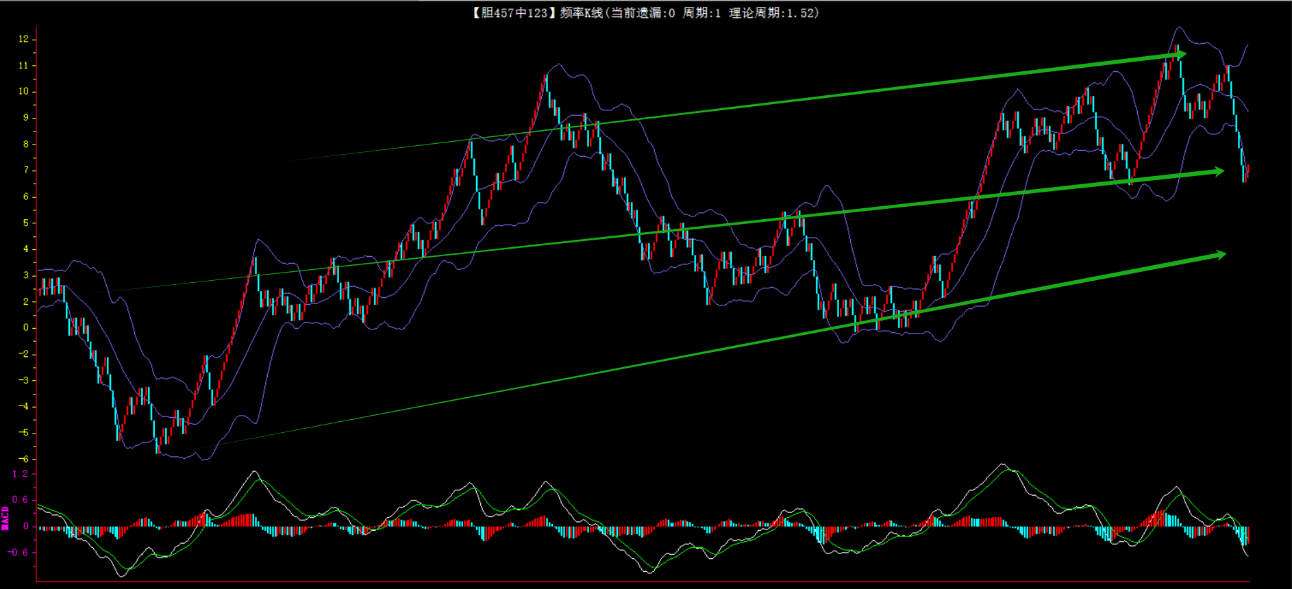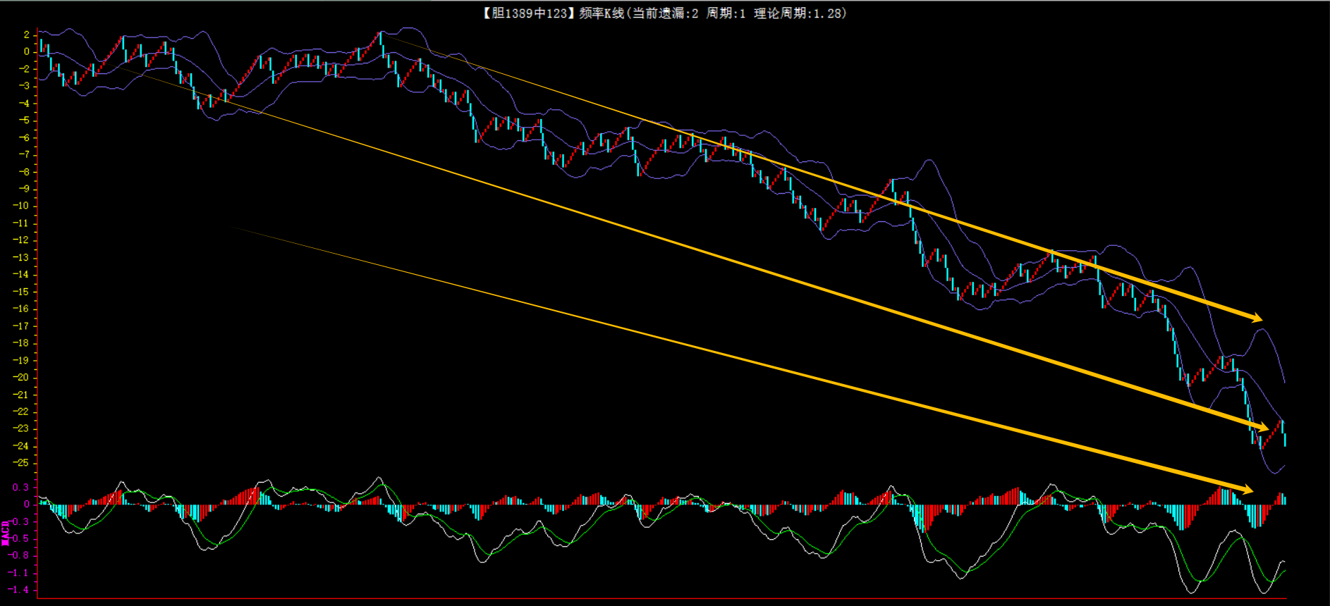 整体趋势下行,上边沿线趋势向下,下边沿趋势也是向下,节点震荡,当前遗漏2期,本期防守。
