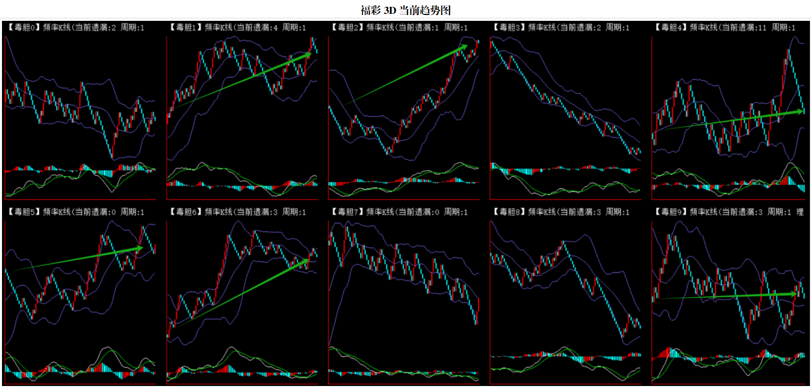 整体趋势上行,上边沿线趋势向上,下边沿趋势也是向上,节点震荡,当前遗漏1期,本期关注。
