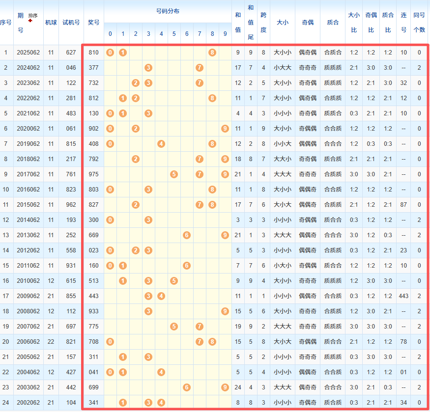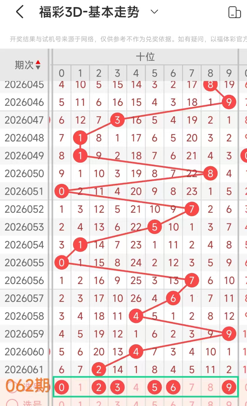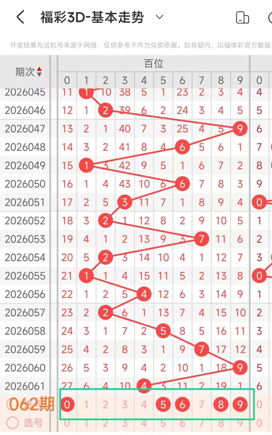 3、当个位开出9后下期开出:5066896212,经统计0号出1次、1号出现1次、2号出现2次、3号出现0次、4号出现0次、5号出现1次、6号出现3次、7号出现0次、8号出现1次、9号出现1次。观察发现26号近期没有出现,本期可以考虑。
