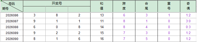 2026086期开奖号码382,我们可以看出近30期百位3出现1次,十位8出现3次,个位2出现4次。