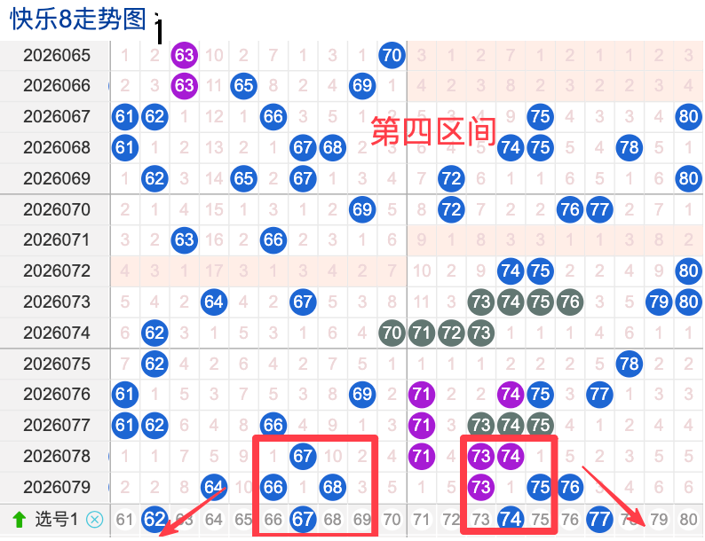 上期四区间开出了6个奖号(64.66.68.73.75.76)上期的四区开6个奖号呈现了一个递增趋势,开出的奖号6头回补3码,7头回补3码,先来看号码62在近 30 期内属于还是很稳定的号码,近期出现频率相对热,偶尔会间隔多期后出现一次,这个号码要注意防守,号码67具有一定的间歇性近期活跃度还是很稳定比如有时会间隔3到5期就再次出现,有时会间隔多期,近期整体出现频率比较热,近期还是要关注的.号码74活跃度近期比较热,有一定的间歇性,整体走势有一定的波动性.