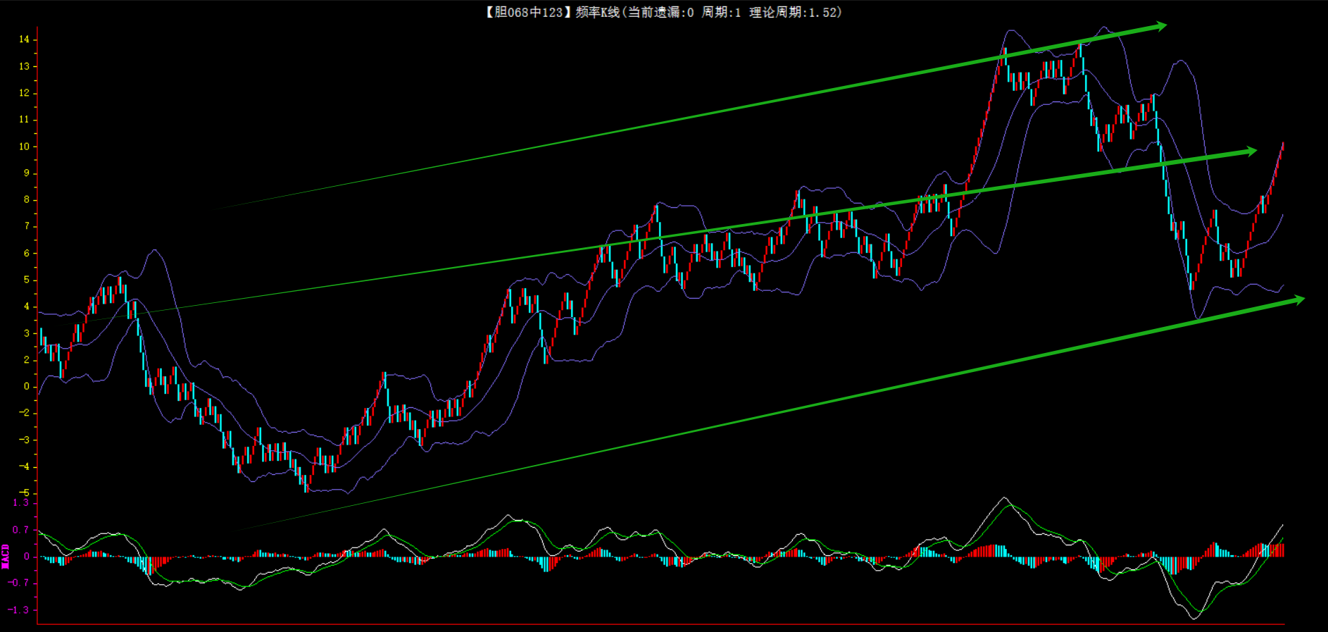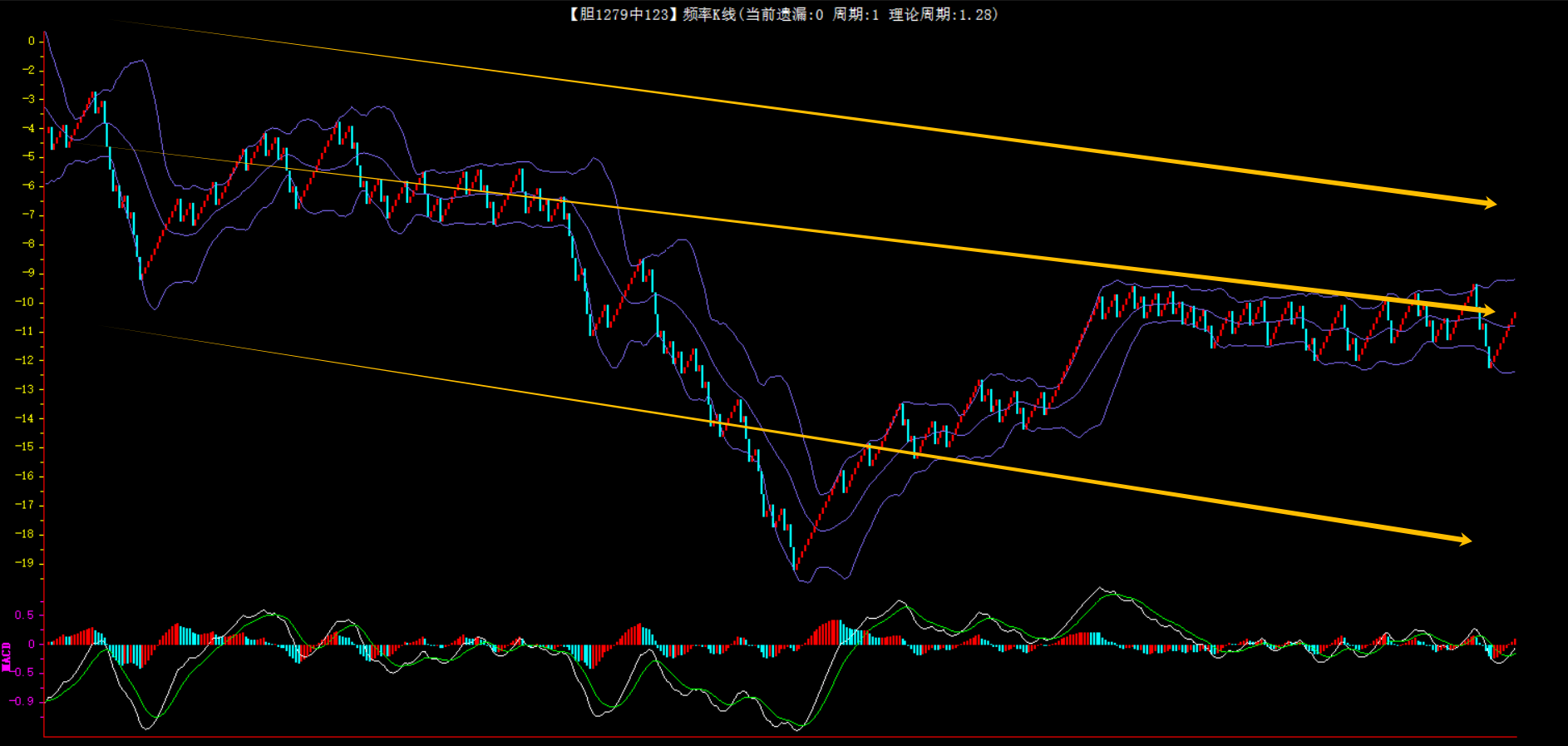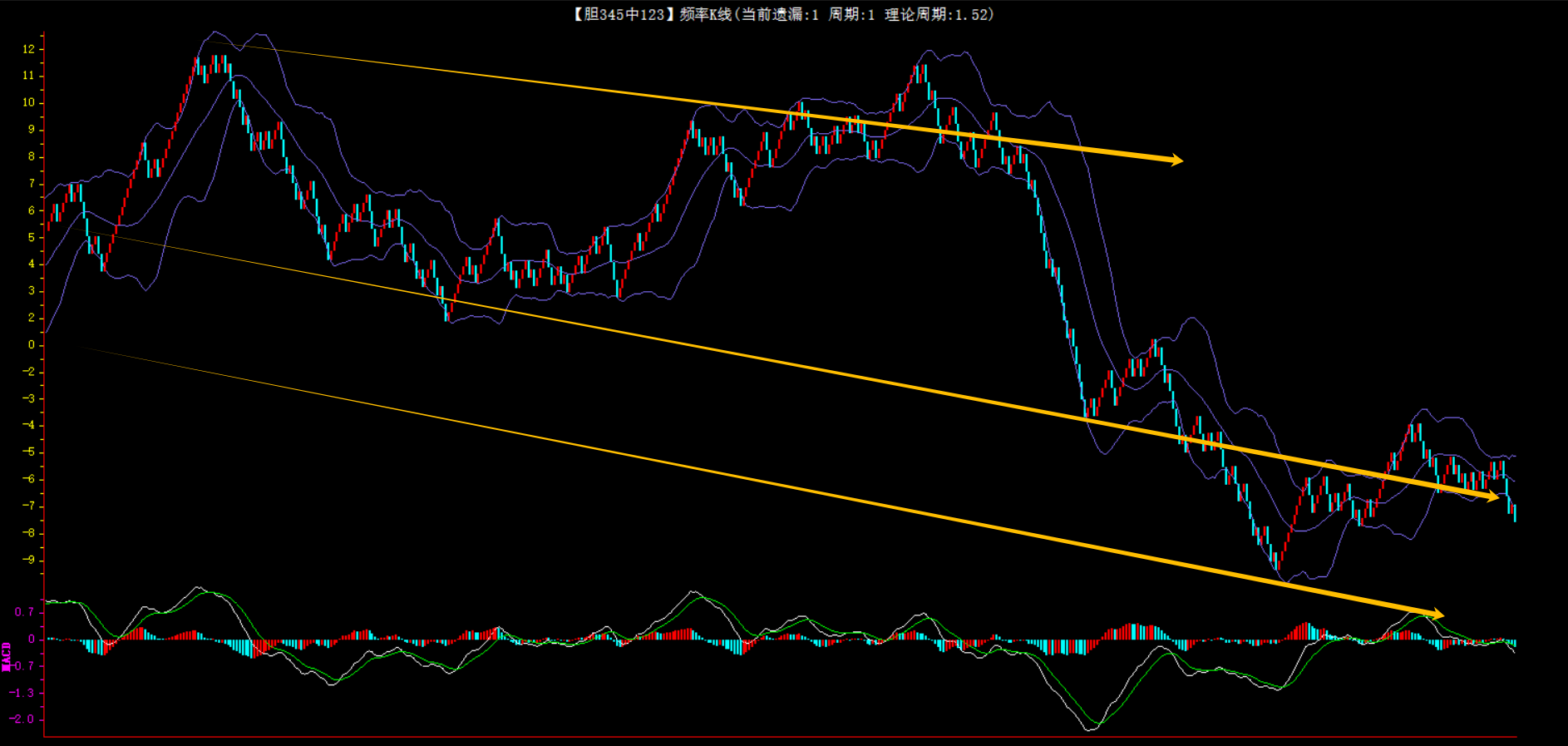 整体趋势下行,上边沿线趋势向下,下边沿趋势也是向下,节点震荡,当前开1期,本期防守。