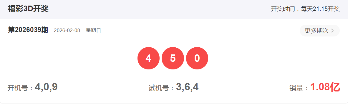 福彩3D2026年2月8日第039期开奖号码是450,和值9,跨度5,偶奇偶,小大小,组六形态