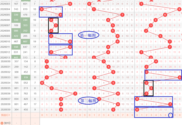 这是一张叠加图,利用百位来分析个位的走势图,在百位出现了黑颜色232,在个位同样也出现了黑颜色232,在百位黑颜色框的上期出现了蓝颜色框04,在黑颜色框的下期出现了蓝颜色26,0和4是两码差4,0和4是由小到大的排列方式,2和6也是由小到大的排列方式,紧接着又出现了蓝颜色框62,6和2也是两码差4,在个位黑颜色框的上期出现了蓝颜色框29,2和9是两码差7,2和9是由小到大的排列方式,在黑颜色框的下期出现了蓝颜色07,0和7也是两码差7,0和7也是由小到大的排列方式,那么轮到今天,会不会同样出现两码差7,文字表达不太清楚,大家可以观看上面的视频
