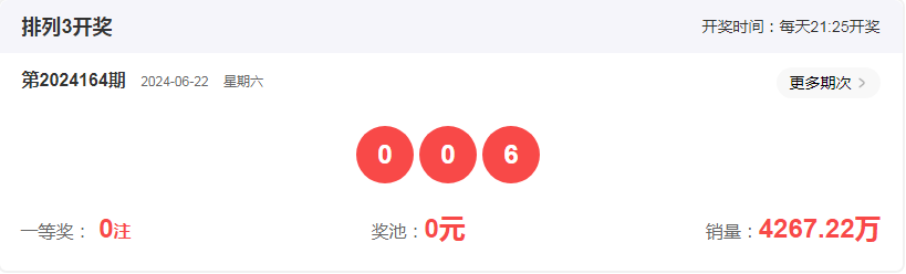 排列三第164期开奖回顾:开奖号码:006,形态:组三