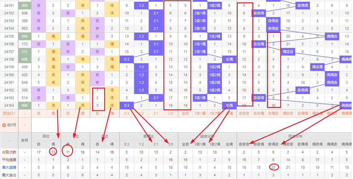 排列三 奇偶分析:从上图可以看出排列三100期内百位奇偶比为55比45,十位奇偶比为52比48,个位奇偶比为49比51,个位的比值比较均衡,但是百位的比值偏差就有点大,历史奇偶形态近2期开出偶偶偶后下一期的走势为,第134期开出偶偶偶后第135期开奇偶奇, 第125期开出偶偶偶后第126期开奇奇奇, 第138期开出偶偶偶后第139期开奇奇偶。本期应该重点关注奇偶奇防奇奇奇所以排列三第165期奇偶形态推荐奇偶奇防奇奇奇。